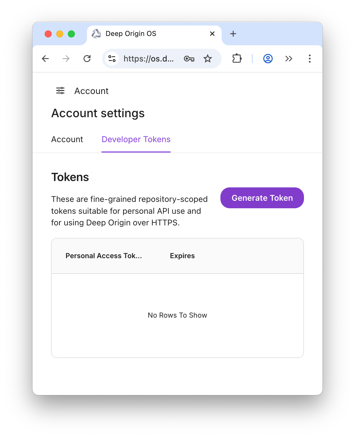 Navigate to https://os.deeporigin.io/account?tab=tokens. You will see a screen similar to:
